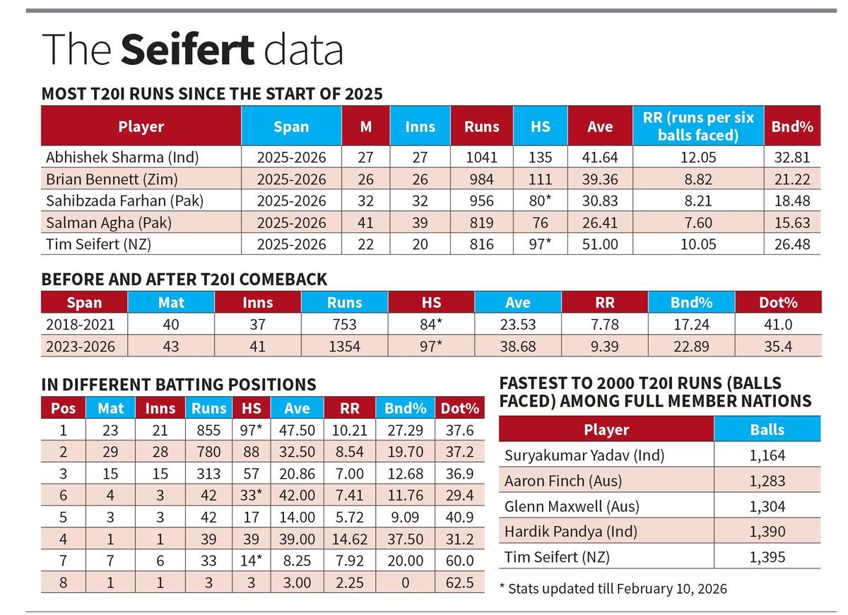 51 (20 पारियों में 1,041 रन) की औसत से 816 रनों के साथ, सीफर्ट 2025 के बाद से टी20ई में शीर्ष पांच रन बनाने वालों में भी शामिल है, इस सूची में भारत के अभिषेक शर्मा (27 पारियों में 1,041 रन) शामिल हैं।